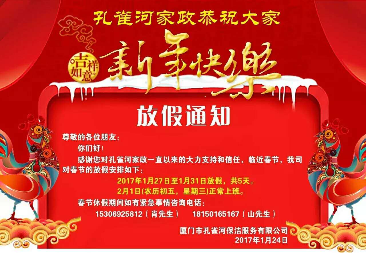 孔雀河家政春節(jié)放假通知
